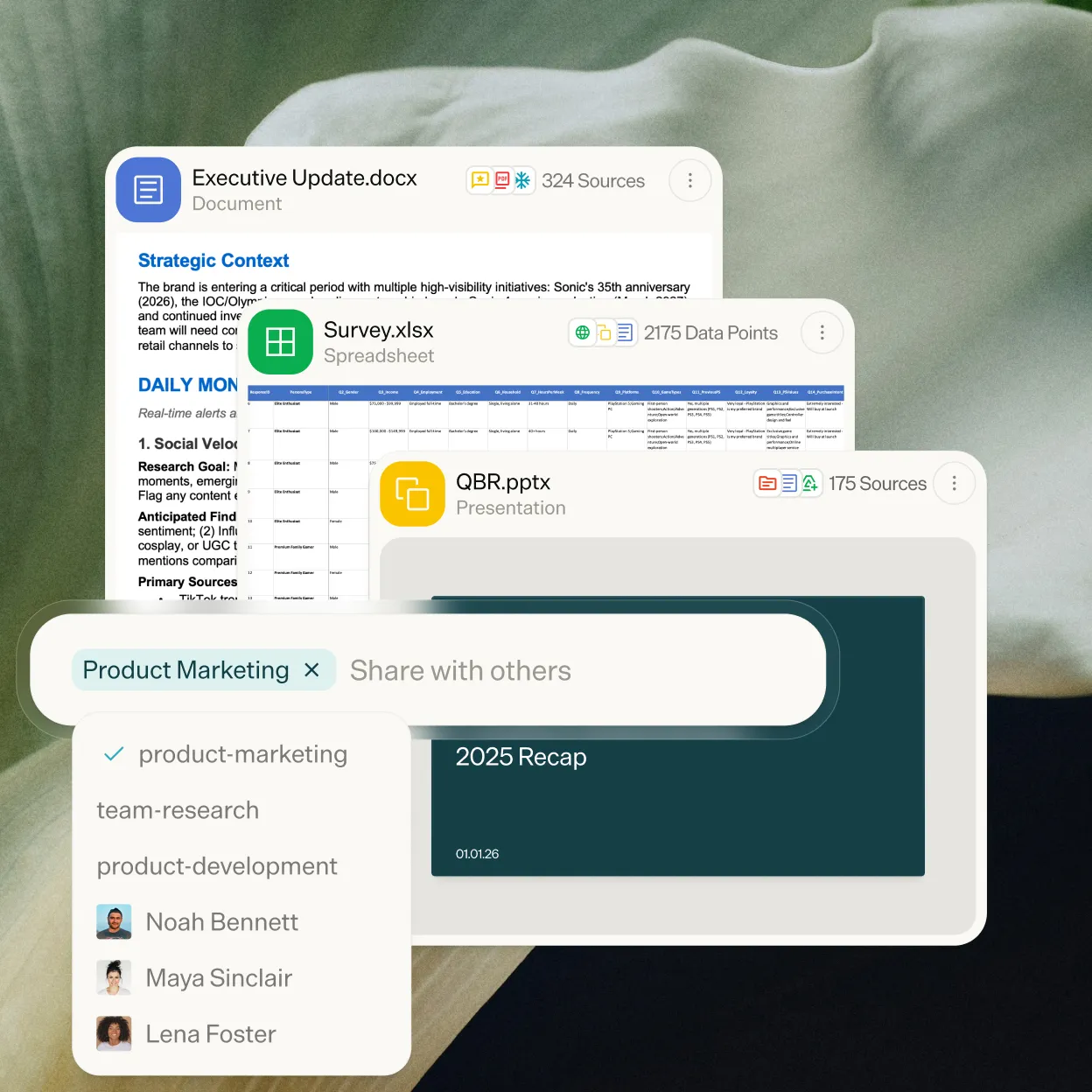 Query internal docs, consumer reviews, social data, and structured datasets - all in one place, in seconds.