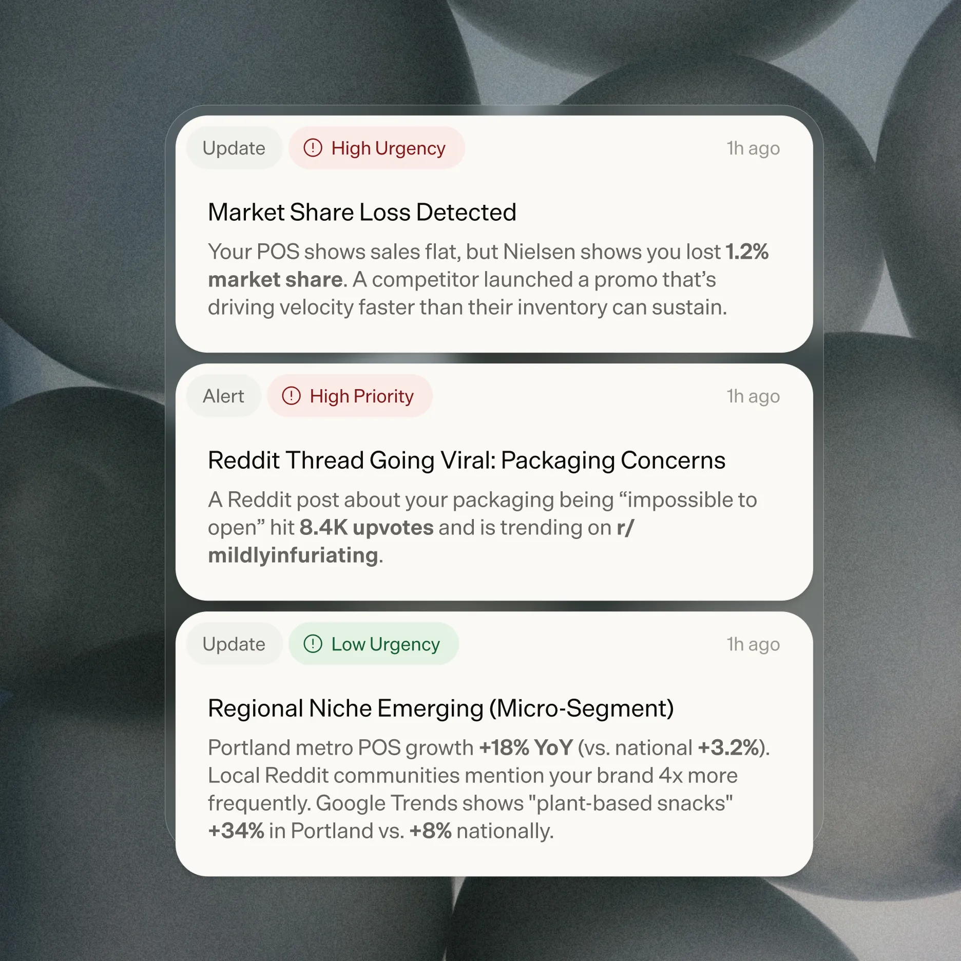 Proactive alerts for sentiment shifts, competitive moves, and portfolio performance before they become problems.